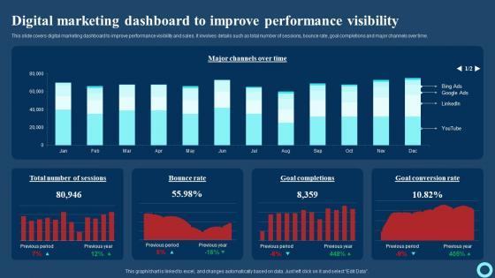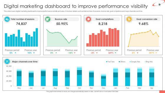 This slide covers digital marketing dashboard to improve performance visibility and sales. It involves details such as total number of sessions, bounce rate, goal completions and major channels over time. Do you have an important presentation coming up Are you looking for something that will make your presentation stand out from the rest Look no further than Marketing Strategies For Effective Digital Marketing Dashboard To Improve. With our professional designs, you can trust that your presentation will pop and make delivering it a smooth process. And with Slidegeeks, you can trust that your presentation will be unique and memorable. So why wait Grab Marketing Strategies For Effective Digital Marketing Dashboard To Improve today and make your presentation stand out from the rest This slide covers digital marketing dashboard to improve performance visibility and sales. It involves details such as total number of sessions, bounce rate, goal completions and major channels over time.