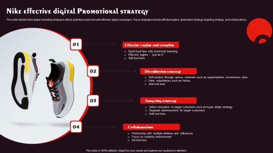 This slide exhibits Nike digital marketing strategy to attract potential customers with effective digital campaigns. These strategies include effective tagline, distribution strategy, targeting strategy, and collaborations. Pitch your topic with ease and precision using this Nike Effective Digital Promotional Strategy Professional Pdf This layout presents information on Effective Tagline, Distribution Strategy, Targeting Strategy Collaborations It is also available for immediate download and adjustment. So, changes can be made in the color, design, graphics or any other component to create a unique layout. This slide exhibits Nike digital marketing strategy to attract potential customers with effective digital campaigns. These strategies include effective tagline, distribution strategy, targeting strategy, and collaborations.