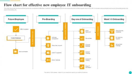 This slide represents the flowchart that guides the companies to effectively conduct IT onboarding process for new employees and conduct regular check-ins by HR. It includes various phases such as pre onboarding phase, day one of onboarding, etc. Pitch your topic with ease and precision using this Flow Chart For Effective New Employee It Onboarding Guidelines Pdf. This layout presents information on Future Employee, Pre Boarding, Day One Of Onboarding. It is also available for immediate download and adjustment. So, changes can be made in the color, design, graphics or any other component to create a unique layout. This slide represents the flowchart that guides the companies to effectively conduct IT onboarding process for new employees and conduct regular check-ins by HR. It includes various phases such as pre onboarding phase, day one of onboarding, etc.