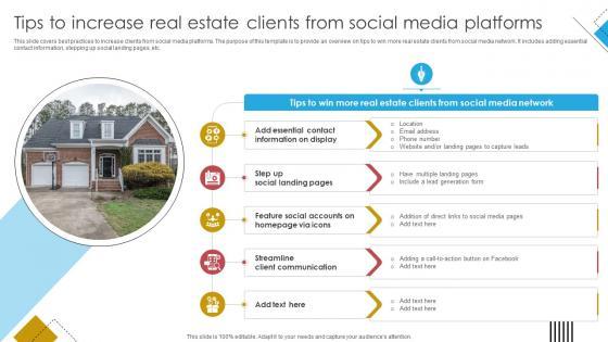 This slide covers best practices to increase clients from social media platforms. The purpose of this template is to provide an overview on tips to win more real estate clients from social media network. It includes adding essential contact information, stepping up social landing pages, etc. Explore a selection of the finest Blueprint For Effective Real Tips To Increase Real Estate Clients From Social Media Strategy SS V here. With a plethora of professionally designed and pre-made slide templates, you can quickly and easily find the right one for your upcoming presentation. You can use our Blueprint For Effective Real Tips To Increase Real Estate Clients From Social Media Strategy SS V to effectively convey your message to a wider audience. Slidegeeks has done a lot of research before preparing these presentation templates. The content can be personalized and the slides are highly editable. Grab templates today from Slidegeeks. This slide covers best practices to increase clients from social media platforms. The purpose of this template is to provide an overview on tips to win more real estate clients from social media network. It includes adding essential contact information, stepping up social landing pages, etc.