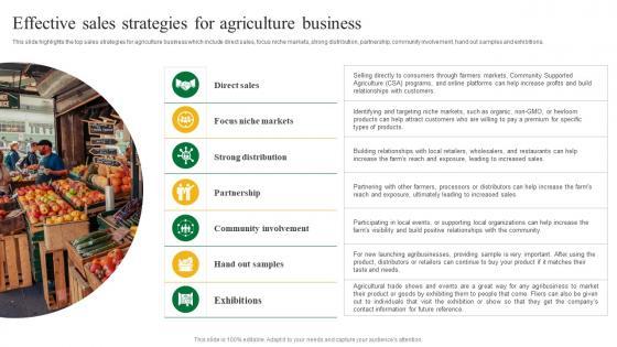 This slide highlights the top sales strategies for agriculture business which include direct sales, focus niche markets, strong distribution, partnership, community involvement, hand out samples and exhibitions. Present like a pro with Agriculture Business Plan Go To Market Strategy Effective Sales Strategies Agriculture Designs Pdf Create beautiful presentations together with your team, using our easy to use presentation slides. Share your ideas in real time and make changes on the fly by downloading our templates. So whether you are in the office, on the go, or in a remote location, you can stay in sync with your team and present your ideas with confidence. With Slidegeeks presentation got a whole lot easier. Grab these presentations today. This slide highlights the top sales strategies for agriculture business which include direct sales, focus niche markets, strong distribution, partnership, community involvement, hand out samples and exhibitions.