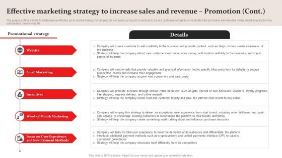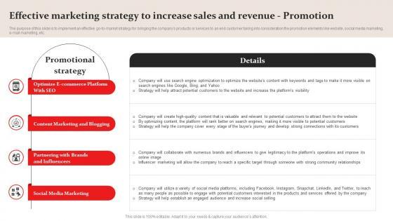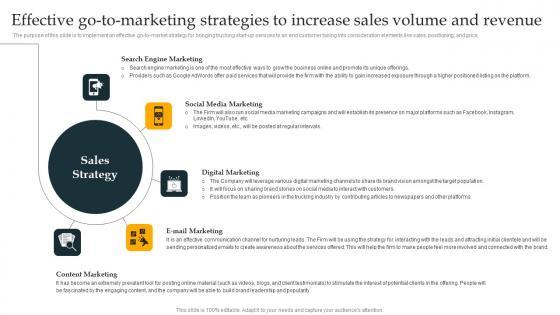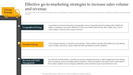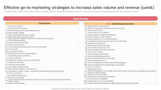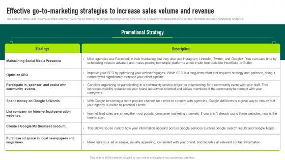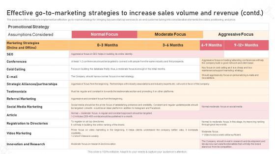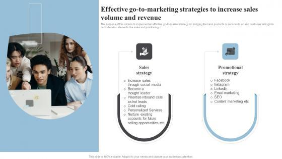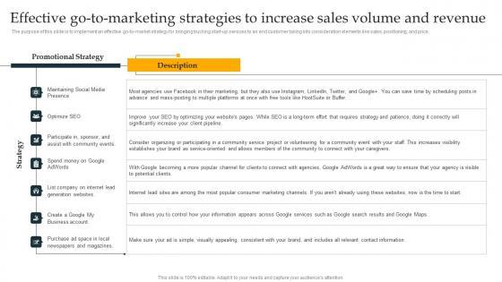 The purpose of this slide is to implement an effective go-to-market strategy for bringing start-up services to an end customer taking into consideration elements like sales, positioning, and price. Find a pre-designed and impeccable Effective Go To Marketing Strategies To Increase Sales Volume And Revenue Guidelines PDF. The templates can ace your presentation without additional effort. You can download these easy-to-edit presentation templates to make your presentation stand out from others. So, what are you waiting for Download the template from Slidegeeks today and give a unique touch to your presentation.