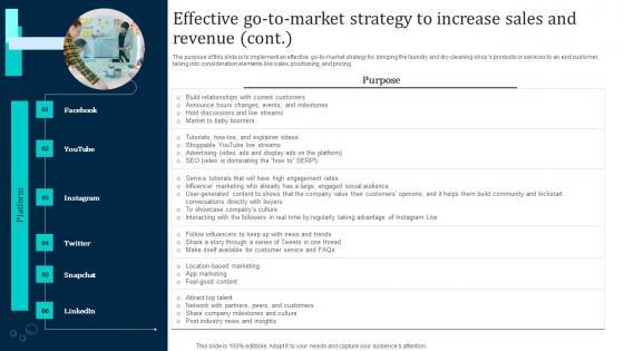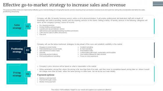 The purpose of this slide is to implement an effective go-to-market strategy for bringing the laundry and dry-cleaning shops products or services to an end customer, taking into consideration elements like sales, positioning, and pricing.Slidegeeks is here to make your presentations a breeze with Effective Go To Market Strategy To Increase Laundromat Business Plan Go To Market Designs Pdf With our easy-to-use and customizable templates, you can focus on delivering your ideas rather than worrying about formatting. With a variety of designs to choose from, you are sure to find one that suits your needs. And with animations and unique photos, illustrations, and fonts, you can make your presentation pop. So whether you are giving a sales pitch or presenting to the board, make sure to check out Slidegeeks first. The purpose of this slide is to implement an effective go to market strategy for bringing the laundry and dry cleaning shops products or services to an end customer, taking into consideration elements like sales, positioning, and pricing.