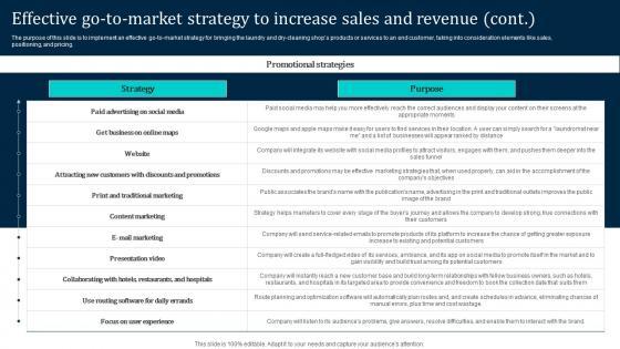 The purpose of this slide is to implement an effective go-to-market strategy for bringing the laundry and dry-cleaning shops products or services to an end customer, taking into consideration elements like sales, positioning, and pricing. Find highly impressive Effective Go To Market Strategy To Increase Sales And Revenue Boutique Business Portrait Pdf on Slidegeeks to deliver a meaningful presentation. You can save an ample amount of time using these presentation templates. No need to worry to prepare everything from scratch because Slidegeeks experts have already done a huge research and work for you. You need to download Effective Go To Market Strategy To Increase Sales And Revenue Boutique Business Portrait Pdf for your upcoming presentation. All the presentation templates are 100 percent editable and you can change the color and personalize the content accordingly. Download now The purpose of this slide is to implement an effective go-to-market strategy for bringing the laundry and dry-cleaning shops products or services to an end customer, taking into consideration elements like sales, positioning, and pricing.