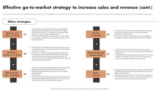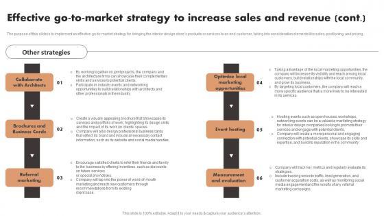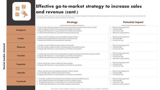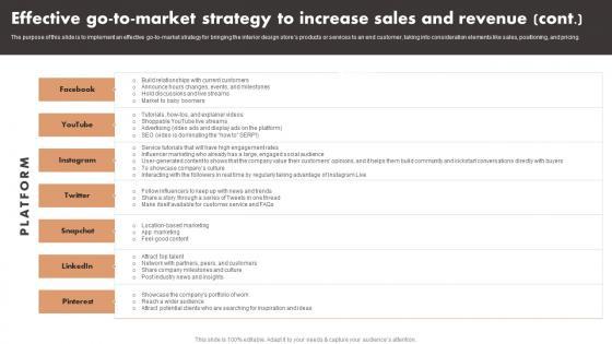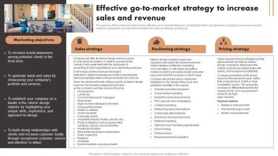 The purpose of this slide is to implement an effective go-to-market strategy for bringing the interior design stores products or services to an end customer, taking into consideration elements like sales, positioning, and pricing. The best PPT templates are a great way to save time, energy, and resources. Slidegeeks have 100 percent editable powerpoint slides making them incredibly versatile. With these quality presentation templates, you can create a captivating and memorable presentation by combining visually appealing slides and effectively communicating your message. Download Effective Go To Market Strategy To Increase Sales And Revenue Luxury Interior Design Professional Pdf from Slidegeeks and deliver a wonderful presentation. The purpose of this slide is to implement an effective go-to-market strategy for bringing the interior design stores products or services to an end customer, taking into consideration elements like sales, positioning, and pricing.