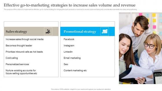 The purpose of this slide is to implement an effective go to market strategy for bringing the bank products or services to an end customer taking into consideration elements like sales and positioning. If you are looking for a format to display your unique thoughts, then the professionally designed Effective Go To Marketing Strategies Increase Banking Start Up B Plan Go To Market Strategy Ideas Pdf is the one for you. You can use it as a Google Slides template or a PowerPoint template. Incorporate impressive visuals, symbols, images, and other charts. Modify or reorganize the text boxes as you desire. Experiment with shade schemes and font pairings. Alter, share or cooperate with other people on your work. Download Effective Go To Marketing Strategies Increase Banking Start Up B Plan Go To Market Strategy Ideas Pdf and find out how to give a successful presentation. Present a perfect display to your team and make your presentation unforgettable. The purpose of this slide is to implement an effective go to market strategy for bringing the bank products or services to an end customer taking into consideration elements like sales and positioning.