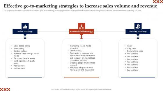 The purpose of this slide is to implement an effective go-to-market strategy for bringing home care start-up services to an end customer taking into consideration elements like sales, positioning, and price. Find highly impressive Effective Go To Marketing Strategies To Increase Sales Volume And Revenue Pictures PDF on Slidegeeks to deliver a meaningful presentation. You can save an ample amount of time using these presentation templates. No need to worry to prepare everything from scratch because Slidegeeks experts have already done a huge research and work for you. You need to download Effective Go To Marketing Strategies To Increase Sales Volume And Revenue Pictures PDF for your upcoming presentation. All the presentation templates are 100 percent editable and you can change the color and personalize the content accordingly. Download now