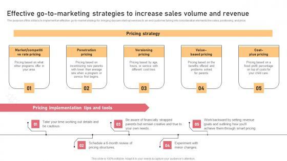 The purpose of this slide is to implement an effective go-to-market strategy for bringing daycare start-up services to an end customer taking into consideration elements like sales, positioning, and price. If your project calls for a presentation, then Slidegeeks is your go-to partner because we have professionally designed, easy-to-edit templates that are perfect for any presentation. After downloading, you can easily edit Effective Go To Marketing Strategies To Increase Sales Childcare Business Plan Clipart Pdf and make the changes accordingly. You can rearrange slides or fill them with different images. Check out all the handy templates The purpose of this slide is to implement an effective go-to-market strategy for bringing daycare start-up services to an end customer taking into consideration elements like sales, positioning, and price.