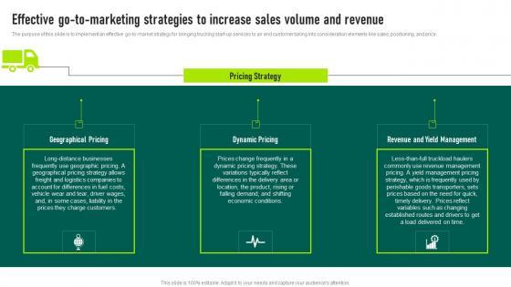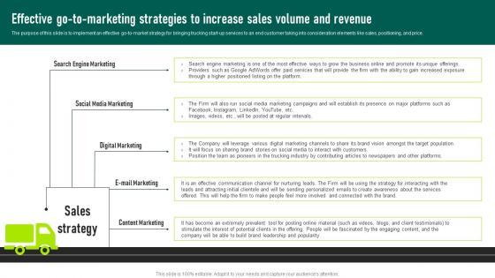 The purpose of this slide is to implement an effective go to market strategy for bringing trucking start up services to an end customer taking into consideration elements like sales, positioning, and price. Do you have an important presentation coming up Are you looking for something that will make your presentation stand out from the rest Look no further than Effective Go To Marketing Strategies To Increase Freight Trucking Business Plan Clipart Pdf With our professional designs, you can trust that your presentation will pop and make delivering it a smooth process. And with Slidegeeks, you can trust that your presentation will be unique and memorable. So why wait Grab Effective Go To Marketing Strategies To Increase Freight Trucking Business Plan Clipart Pdf today and make your presentation stand out from the rest. The purpose of this slide is to implement an effective go to market strategy for bringing trucking start up services to an end customer taking into consideration elements like sales, positioning, and price.