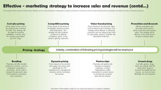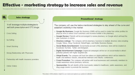 The purpose of this slide is to implement an effective go to market strategy for bringing the companys products or services to an end customer taking into consideration elements like sales, positioning, and price. If you are looking for a format to display your unique thoughts, then the professionally designed Effective Marketing Strategy Increase Pharmacy Business Plan Go To Market Strategy Rules Pdf is the one for you. You can use it as a Google Slides template or a PowerPoint template. Incorporate impressive visuals, symbols, images, and other charts. Modify or reorganize the text boxes as you desire. Experiment with shade schemes and font pairings. Alter, share or cooperate with other people on your work. Download Effective Marketing Strategy Increase Pharmacy Business Plan Go To Market Strategy Rules Pdf and find out how to give a successful presentation. Present a perfect display to your team and make your presentation unforgettable. The purpose of this slide is to implement an effective go to market strategy for bringing the companys products or services to an end customer taking into consideration elements like sales, positioning, and price.