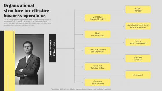 The slide highlights the organizational hierarchy in the company used to define the staff structure. It includes the chief executing officer, project manager, company secretary, human resource manager, head of construction, sales and marketing firm, etc. This modern and well arranged Organizational Structure Effective Real Estate Agent Business Plan Go To Market Strategy Mockup Pdf provides lots of creative possibilities. It is very simple to customize and edit with the Powerpoint Software. Just drag and drop your pictures into the shapes. All facets of this template can be edited with Powerpoint, no extra software is necessary. Add your own material, put your images in the places assigned for them, adjust the colors, and then you can show your slides to the world, with an animated slide included. The slide highlights the organizational hierarchy in the company used to define the staff structure. It includes the chief executing officer, project manager, company secretary, human resource manager, head of construction, sales and marketing firm, etc.