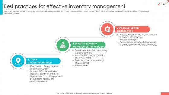 This slide covers best practice for managing inventory more efficiently and boost productivity. It involves approaches such as track product information, invest in inventory management technology and analyze supplier performance.Take your projects to the next level with our ultimate collection of Best Practices For Effective Inventory Management Tech Asset Management Infographics Pdf. Slidegeeks has designed a range of layouts that are perfect for representing task or activity duration, keeping track of all your deadlines at a glance. Tailor these designs to your exact needs and give them a truly corporate look with your own brand colors they all make your projects stand out from the rest. This slide covers best practice for managing inventory more efficiently and boost productivity. It involves approaches such as track product information, invest in inventory management technology and analyze supplier performance.