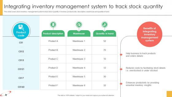 This slide covers stock inventory management system to track stock quantity. It involves product code, description, warehouse and quantity in hand. Crafting an eye-catching presentation has never been more straightforward. Let your presentation shine with this tasteful yet straightforward Marketing Strategies For Effective Integrating Inventory Management System template. It offers a minimalistic and classy look that is great for making a statement. The colors have been employed intelligently to add a bit of playfulness while still remaining professional. Construct the ideal Marketing Strategies For Effective Integrating Inventory Management System that effortlessly grabs the attention of your audience Begin now and be certain to wow your customers This slide covers stock inventory management system to track stock quantity. It involves product code, description, warehouse and quantity in hand.