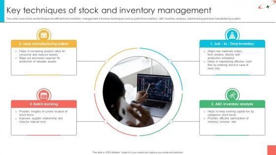 This slide covers tools and techniques for efficient stock inventory management. It involves techniques such as just in time inventory, ABC inventory analysis, batch tracking and lean manufacturing system. This modern and well-arranged Marketing Strategies For Effective Key Techniques Of Stock And Inventory Management provides lots of creative possibilities. It is very simple to customize and edit with the Powerpoint Software. Just drag and drop your pictures into the shapes. All facets of this template can be edited with Powerpoint, no extra software is necessary. Add your own material, put your images in the places assigned for them, adjust the colors, and then you can show your slides to the world, with an animated slide included. This slide covers tools and techniques for efficient stock inventory management. It involves techniques such as just in time inventory, ABC inventory analysis, batch tracking and lean manufacturing system.