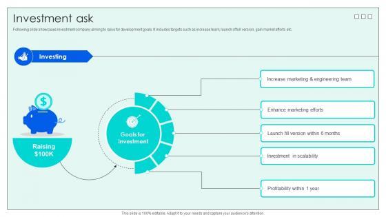 Following slide showcases investment company aiming to raise for development goals. It includes targets such as increase team, launch of full version, gain market efforts etc. Find highly impressive Investment Ask Investor Funding Elevator Pitch Deck For Effective Employee Hiring on Slidegeeks to deliver a meaningful presentation. You can save an ample amount of time using these presentation templates. No need to worry to prepare everything from scratch because Slidegeeks experts have already done a huge research and work for you. You need to download Investment Ask Investor Funding Elevator Pitch Deck For Effective Employee Hiring for your upcoming presentation. All the presentation templates are 100 percent editable and you can change the color and personalize the content accordingly. Download now Following slide showcases investment company aiming to raise for development goals. It includes targets such as increase team, launch of full version, gain market efforts etc.