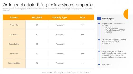 This slide represents online listing of properties that work as one of the source for investors to find properties for flipping. It covers property address, prices, FSBO, auctions etc. From laying roadmaps to briefing everything in detail, our templates are perfect for you. You can set the stage with your presentation slides. All you have to do is download these easy to edit and customizable templates. Online Real Estate Listing For Investment Effective Real Estate Flipping Approaches Clipart Pdf will help you deliver an outstanding performance that everyone would remember and praise you for. Do download this presentation today. This slide represents online listing of properties that work as one of the source for investors to find properties for flipping. It covers property address, prices, FSBO, auctions etc.