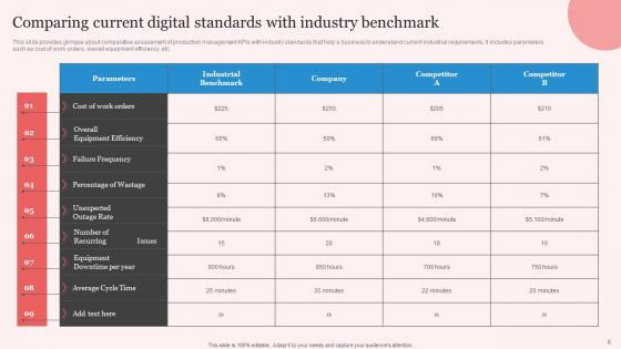 This slide provides glimpse about comparative assessment of production management KPIs with industry standards that help a business to understand current industrial requirements. It includes parameters such as cost of work orders, overall equipment efficiency, etc. Coming up with a presentation necessitates that the majority of the effort goes into the content and the message you intend to convey. The visuals of a PowerPoint presentation can only be effective if it supplements and supports the story that is being told. Keeping this in mind our experts created Effective Manufacturing Planning And Control Administration System Comparing Current Digital Standards Introduction PDF to reduce the time that goes into designing the presentation. This way, you can concentrate on the message while our designers take care of providing you with the right template for the situation.