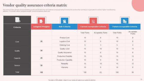 This slide provides glimpse about establishing quality standards for the raw materials and equipment provided by the vendors that can help an organization to achieve higher manufacturing efficiency. It includes criteria, assigned weights, current acceptable criteria, etc. Explore a selection of the finest Effective Manufacturing Planning And Control Administration System Vendor Quality Assurance Criteria Matrix Clipart PDF here. With a plethora of professionally designed and pre made slide templates, you can quickly and easily find the right one for your upcoming presentation. You can use our Effective Manufacturing Planning And Control Administration System Vendor Quality Assurance Criteria Matrix Clipart PDF to effectively convey your message to a wider audience. Slidegeeks has done a lot of research before preparing these presentation templates. The content can be personalized and the slides are highly editable. Grab templates today from Slidegeeks.