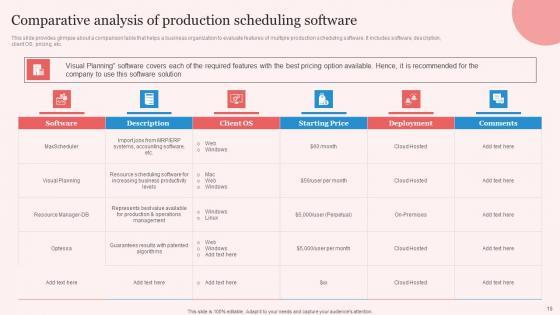 This slide provides glimpse about a comparison table that helps a business organization to evaluate features of multiple production scheduling software. It includes software, description, client OS, pricing, etc. Slidegeeks has constructed Effective Manufacturing Planning And Control Administration System Comparative Analysis Of Production Introduction PDF after conducting extensive research and examination. These presentation templates are constantly being generated and modified based on user preferences and critiques from editors. Here, you will find the most attractive templates for a range of purposes while taking into account ratings and remarks from users regarding the content. This is an excellent jumping-off point to explore our content and will give new users an insight into our top-notch PowerPoint Templates.