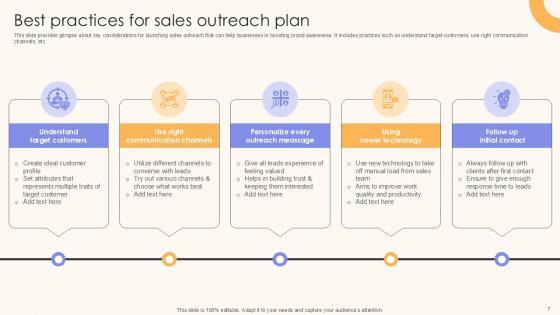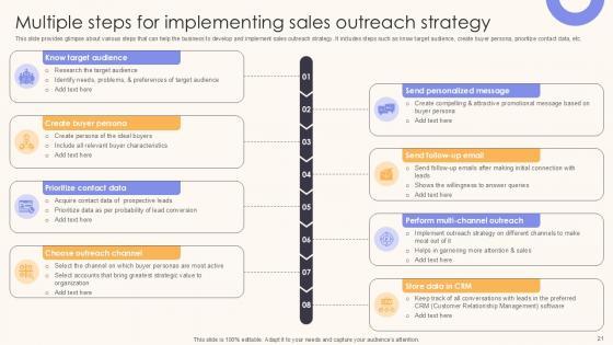 This slide covers different steps to create sales outreach plan. The purpose is to develop a plan is to create awareness and communicate with target audience . The various steps are determined goals and objectives, identify target audience, create message, package message and distribute message.Presenting Steps To Build Effective Sales Outreach Program Icons PDF to dispense important information. This template comprises five stages. It also presents valuable insights into the topics including Determine Goals, Objectives, Identify Target Audience, Create Message. This is a completely customizable PowerPoint theme that can be put to use immediately. So, download it and address the topic impactfully.