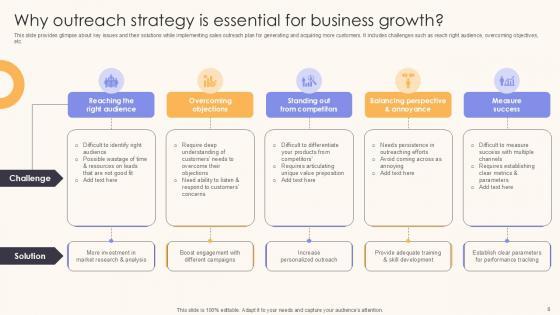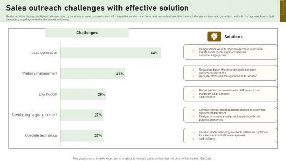 Mentioned slide displays multiple challenges faced by business in sales communication with respective solution to achieve business milestones. It includes challenges such as lead generation, website management, low budget, developing targeting content and obsolete technology. Pitch your topic with ease and precision using this Sales Outreach Challenges With Effective Solution Themes Pdf. This layout presents information on Sales Outreach Challenges, Developing Targeting Content, Obsolete Technology. It is also available for immediate download and adjustment. So, changes can be made in the color, design, graphics or any other component to create a unique layout. Mentioned slide displays multiple challenges faced by business in sales communication with respective solution to achieve business milestones. It includes challenges such as lead generation, website management, low budget, developing targeting content and obsolete technology.