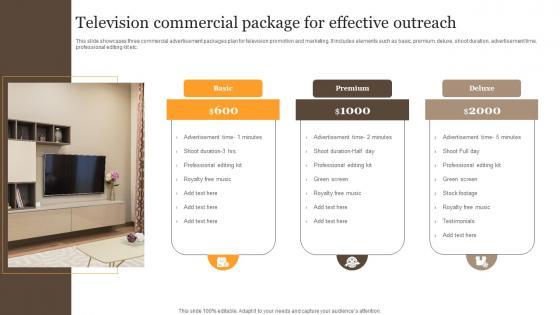 This slide showcases three commercial advertisement packages plan for television promotion and marketing. It includes elements such as basic, premium, deluxe, shoot duration, advertisement time, professional editing kit etc. Pitch your topic with ease and precision using this Television Commercial Package For Effective Outreach Icons Pdf. This layout presents information on Basic, Premium, Deluxe. It is also available for immediate download and adjustment. So, changes can be made in the color, design, graphics or any other component to create a unique layout. This slide showcases three commercial advertisement packages plan for television promotion and marketing. It includes elements such as basic, premium, deluxe, shoot duration, advertisement time, professional editing kit etc.