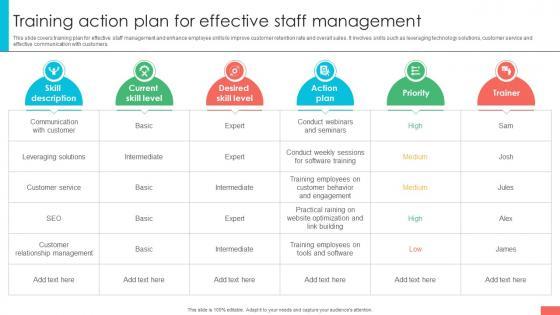 This slide covers training plan for effective staff management and enhance employee skills to improve customer retention rate and overall sales. It involves skills such as leveraging technology solutions, customer service and effective communication with customers. Present like a pro with Implementing Strategies To Enhance Training Action Plan For Effective Staff Management. Create beautiful presentations together with your team, using our easy-to-use presentation slides. Share your ideas in real-time and make changes on the fly by downloading our templates. So whether you are in the office, on the go, or in a remote location, you can stay in sync with your team and present your ideas with confidence. With Slidegeeks presentation got a whole lot easier. Grab these presentations today. This slide covers training plan for effective staff management and enhance employee skills to improve customer retention rate and overall sales. It involves skills such as leveraging technology solutions, customer service and effective communication with customers.