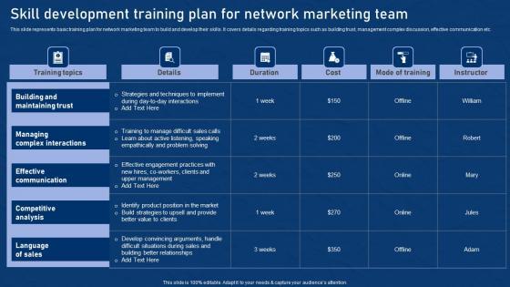 This slide represents basic training plan for network marketing team to build and develop their skills. It covers details regarding training topics such as building trust, management complex discussion, effective communication etc. Coming up with a presentation necessitates that the majority of the effort goes into the content and the message you intend to convey. The visuals of a PowerPoint presentation can only be effective if it supplements and supports the story that is being told. Keeping this in mind our experts created Skill Development Training Plan Network Effective Network Marketing Promotion Tactics Slides Pdf to reduce the time that goes into designing the presentation. This way, you can concentrate on the message while our designers take care of providing you with the right template for the situation. This slide represents basic training plan for network marketing team to build and develop their skills. It covers details regarding training topics such as building trust, management complex discussion, effective communication etc.