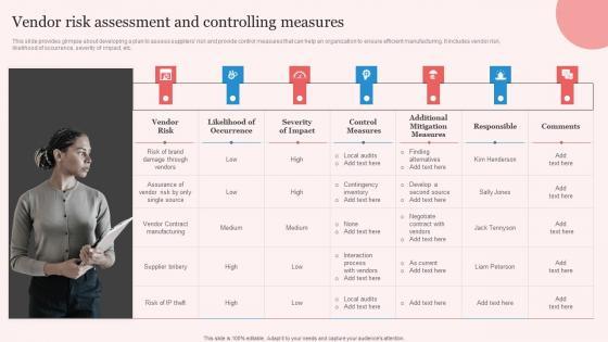 This slide provides glimpse about developing a plan to assess suppliers risk and provide control measures that can help an organization to ensure efficient manufacturing. It includes vendor risk, likelihood of occurrence, severity of impact, etc. Slidegeeks has constructed Effective Production Planning And Monitoring Techniques Vendor Risk Assessment And Controlling Measures Guidelines PDF after conducting extensive research and examination. These presentation templates are constantly being generated and modified based on user preferences and critiques from editors. Here, you will find the most attractive templates for a range of purposes while taking into account ratings and remarks from users regarding the content. This is an excellent jumping off point to explore our content and will give new users an insight into our top notch PowerPoint Templates.