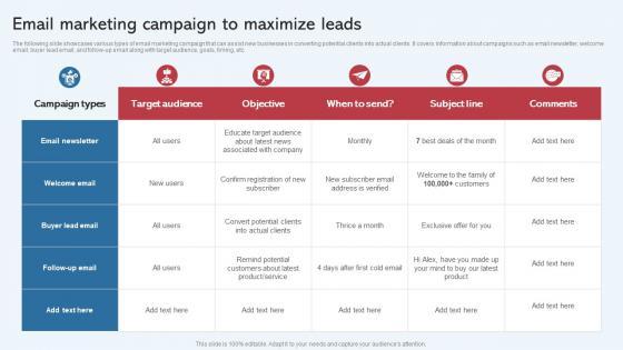 The following slide showcases various types of email marketing campaign that can assist new businesses in converting potential clients into actual clients. It covers information about campaigns such as email newsletter, welcome email, buyer lead email, and follow up email along with target audience, goals, timing, etc. Whether you have daily or monthly meetings, a brilliant presentation is necessary. Email Marketing Campaign To Maximize Leads Effective Startup Promotion Plan Professional Pdf can be your best option for delivering a presentation. Represent everything in detail using Email Marketing Campaign To Maximize Leads Effective Startup Promotion Plan Professional Pdf and make yourself stand out in meetings. The template is versatile and follows a structure that will cater to your requirements. All the templates prepared by Slidegeeks are easy to download and edit. Our research experts have taken care of the corporate themes as well. So, give it a try and see the results. The following slide showcases various types of email marketing campaign that can assist new businesses in converting potential clients into actual clients. It covers information about campaigns such as email newsletter, welcome email, buyer lead email, and follow up email along with target audience, goals, timing, etc.