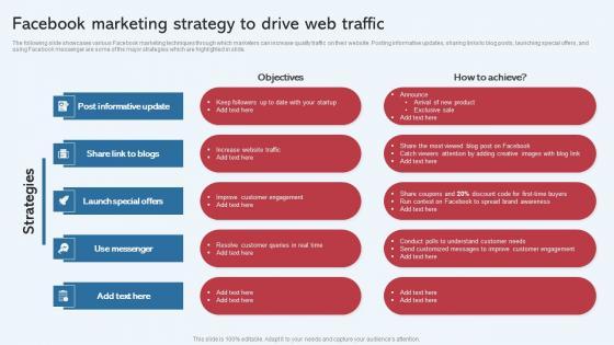 The following slide showcases various Facebook marketing techniques through which marketers can increase quality traffic on their website. Posting informative updates, sharing links to blog posts, launching special offers, and using Facebook messenger are some of the major strategies which are highlighted in slide. If your project calls for a presentation, then Slidegeeks is your go to partner because we have professionally designed, easy to edit templates that are perfect for any presentation. After downloading, you can easily edit Facebook Marketing Strategy To Drive Web Traffic Effective Startup Promotion Plan Guidelines Pdf and make the changes accordingly. You can rearrange slides or fill them with different images. Check out all the handy templates. The following slide showcases various Facebook marketing techniques through which marketers can increase quality traffic on their website. Posting informative updates, sharing links to blog posts, launching special offers, and using Facebook messenger are some of the major strategies which are highlighted in slide.