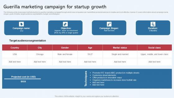 The following slide showcases brief introduction to guerilla marketing campaign through which new companies can market their products services in creative and cost effective manner. It covers information about campaign name, slogan, goals, timeline, target audience segmentation, budget, and strategies. If you are looking for a format to display your unique thoughts, then the professionally designed Guerilla Marketing Campaign For Startup Growth Effective Startup Promotion Plan Sample Pdf is the one for you. You can use it as a Google Slides template or a PowerPoint template. Incorporate impressive visuals, symbols, images, and other charts. Modify or reorganize the text boxes as you desire. Experiment with shade schemes and font pairings. Alter, share or cooperate with other people on your work. Download Guerilla Marketing Campaign For Startup Growth Effective Startup Promotion Plan Sample Pdf and find out how to give a successful presentation. Present a perfect display to your team and make your presentation unforgettable. The following slide showcases brief introduction to guerilla marketing campaign through which new companies can market their products services in creative and cost effective manner. It covers information about campaign name, slogan, goals, timeline, target audience segmentation, budget, and strategies.