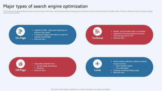 The following slide showcases various types of search engine optimization SEO through which marketing teams can increase visitors to website and gain competitive edge. The types outlined in slide are on page, off page, technical and local SEO. Explore a selection of the finest Major Types Of Search Engine Optimization Effective Startup Promotion Plan Introduction Pdf here. With a plethora of professionally designed and pre made slide templates, you can quickly and easily find the right one for your upcoming presentation. You can use our Major Types Of Search Engine Optimization Effective Startup Promotion Plan Introduction Pdf to effectively convey your message to a wider audience. Slidegeeks has done a lot of research before preparing these presentation templates. The content can be personalized and the slides are highly editable. Grab templates today from Slidegeeks. The following slide showcases various types of search engine optimization SEO through which marketing teams can increase visitors to website and gain competitive edge. The types outlined in slide are on page, off page, technical and local SEO.