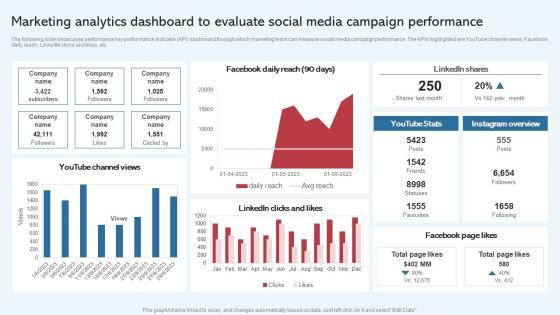 The following slide showcases performance key performance indicator KPI dashboard through which marketing team can measure social media campaign performance. The KPIs highlighted are YouTube channel views, Facebook daily reach, LinkedIn clicks and likes, etc. The best PPT templates are a great way to save time, energy, and resources. Slidegeeks have 100 percent editable powerpoint slides making them incredibly versatile. With these quality presentation templates, you can create a captivating and memorable presentation by combining visually appealing slides and effectively communicating your message. Download Marketing Analytics Dashboard To Evaluate Social Effective Startup Promotion Structure Rules Pdf from Slidegeeks and deliver a wonderful presentation. The following slide showcases performance key performance indicator KPI dashboard through which marketing team can measure social media campaign performance. The KPIs highlighted are YouTube channel views, Facebook daily reach, LinkedIn clicks and likes, etc.