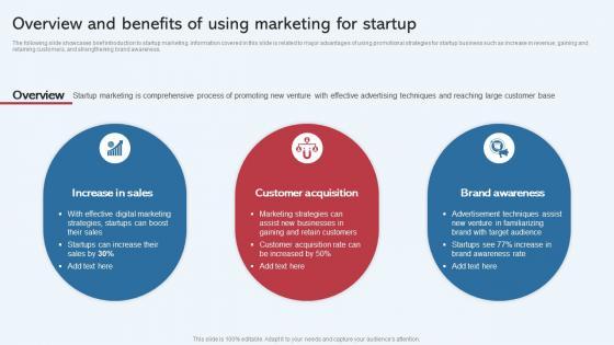 The following slide showcases brief introduction to startup marketing. Information covered in this slide is related to major advantages of using promotional strategies for startup business such as increase in revenue, gaining and retaining customers, and strengthening brand awareness. Slidegeeks has constructed Overview And Benefits Of Using Marketing For Startup Effective Startup Promotion Plan Pictures Pdf after conducting extensive research and examination. These presentation templates are constantly being generated and modified based on user preferences and critiques from editors. Here, you will find the most attractive templates for a range of purposes while taking into account ratings and remarks from users regarding the content. This is an excellent jumping off point to explore our content and will give new users an insight into our top notch PowerPoint Templates. The following slide showcases brief introduction to startup marketing. Information covered in this slide is related to major advantages of using promotional strategies for startup business such as increase in revenue, gaining and retaining customers, and strengthening brand awareness.