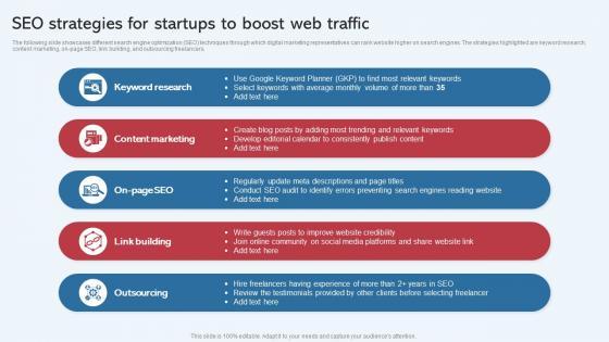 The following slide showcases different search engine optimization SEO techniques through which digital marketing representatives can rank website higher on search engines. The strategies highlighted are keyword research, content marketing, on page SEO, link building, and outsourcing freelancers. Slidegeeks is one of the best resources for PowerPoint templates. You can download easily and regulate Seo Strategies For Startups To Boost Web Traffic Effective Startup Promotion Plan Ideas Pdf for your personal presentations from our wonderful collection. A few clicks is all it takes to discover and get the most relevant and appropriate templates. Use our Templates to add a unique zing and appeal to your presentation and meetings. All the slides are easy to edit and you can use them even for advertisement purposes. The following slide showcases different search engine optimization SEO techniques through which digital marketing representatives can rank website higher on search engines. The strategies highlighted are keyword research, content marketing, on page SEO, link building, and outsourcing freelancers.
