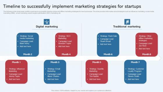 The following slide showcases monthly roadmap to successfully develop online and offline marketing strategies for new businesses. The slide provides information about strategies such as influencer marketing, social media marketing SMM, email marketing, search engine optimization SEO marketing, etc. Find a pre designed and impeccable Timeline To Successfully Implement Marketing Strategies Effective Startup Promotion Plan Template Pdf. The templates can ace your presentation without additional effort. You can download these easy to edit presentation templates to make your presentation stand out from others. So, what are you waiting for Download the template from Slidegeeks today and give a unique touch to your presentation. The following slide showcases monthly roadmap to successfully develop online and offline marketing strategies for new businesses. The slide provides information about strategies such as influencer marketing, social media marketing SMM, email marketing, search engine optimization SEO marketing, etc.