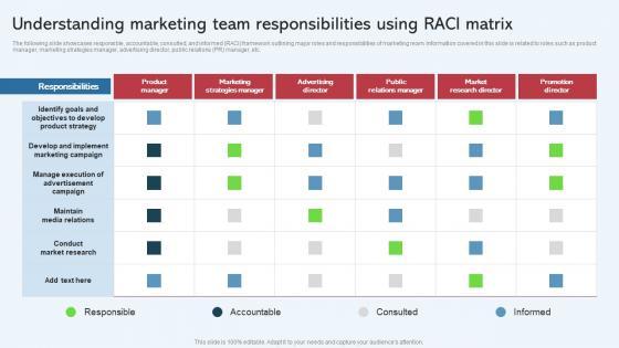The following slide showcases responsible, accountable, consulted, and informed RACI framework outlining major roles and responsibilities of marketing ream. Information covered in this slide is related to roles such as product manager, marketing strategies manager, advertising director, public relations PR manager, etc. Want to ace your presentation in front of a live audience Our Understanding Marketing Team Responsibilities Using Effective Startup Promotion Plan Summary Pdf can help you do that by engaging all the users towards you. Slidegeeks experts have put their efforts and expertise into creating these impeccable powerpoint presentations so that you can communicate your ideas clearly. Moreover, all the templates are customizable, and easy to edit and downloadable. Use these for both personal and commercial use. The following slide showcases responsible, accountable, consulted, and informed RACI framework outlining major roles and responsibilities of marketing ream. Information covered in this slide is related to roles such as product manager, marketing strategies manager, advertising director, public relations PR manager, etc.