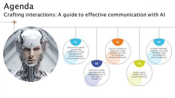 Boost your pitch with our creative Agenda Crafting Interactions A Guide To Effective Communication With AI SS V. Deliver an awe-inspiring pitch that will mesmerize everyone. Using these presentation templates you will surely catch everyones attention. You can browse the ppts collection on our website. We have researchers who are experts at creating the right content for the templates. So you do not have to invest time in any additional work. Just grab the template now and use them. Our Agenda Crafting Interactions A Guide To Effective Communication With AI SS V are topically designed to provide an attractive backdrop to any subject. Use them to look like a presentation pro.