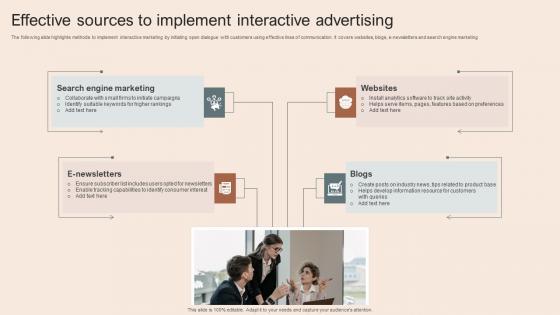 The following slide highlights methods to implement interactive marketing by initiating open dialogue with customers using effective lines of communication. It covers websites, blogs, e-newsletters and search engine marketing. Showcasing this set of slides titled Effective Sources To Implement Interactive Advertising. The topics addressed in these templates are Search Engine Marketing, Websites, Implement Interactive Advertising. All the content presented in this PPT design is completely editable. Download it and make adjustments in color, background, font etc. as per your unique business setting. The following slide highlights methods to implement interactive marketing by initiating open dialogue with customers using effective lines of communication. It covers websites, blogs, e-newsletters and search engine marketing.