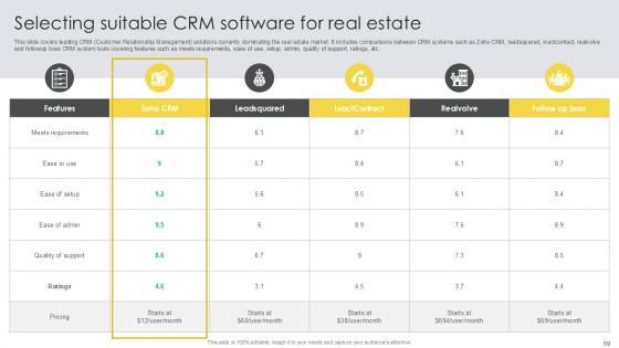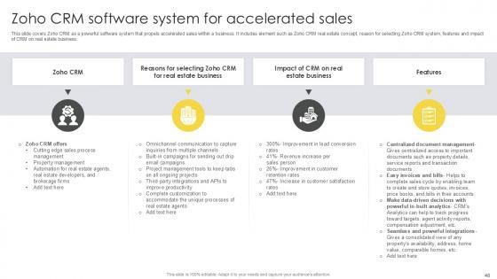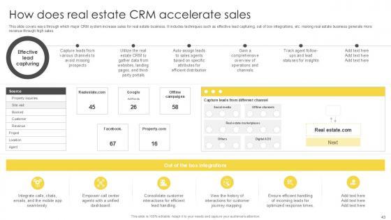 Want to out do your competitors. Create a persuasive presentation template, pitch your business offerings, and win your clients using this well-structured Streamlining Real Estate CRM For Effective Customer Interactions Ppt Slide. Deploy this presentation template of colorful, graphical eighty three slides that encourages a roomful of people to go through the entire proposal. Use this actionable PPT slide and highlight your company background, products, team, and experience to create the desired impact. Incorporate this presentation template and save time and effort in creating a presentation from scratch to highlight the uniqueness of your business. Download now. Our Streamlining Real Estate CRM For Effective Customer Interactions Ppt Slide are topically designed to provide an attractive backdrop to any subject. Use them to look like a presentation pro.