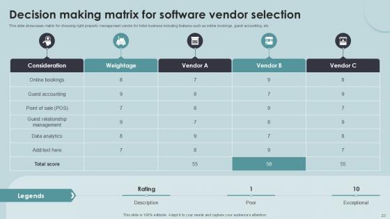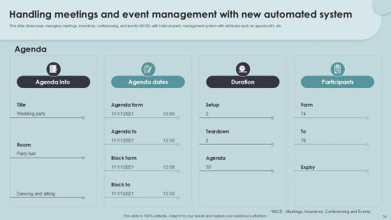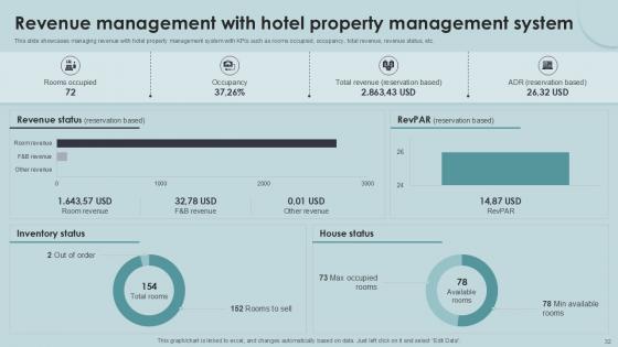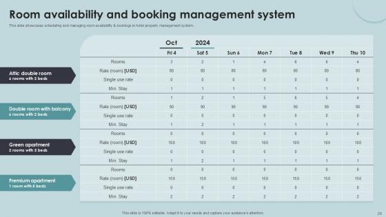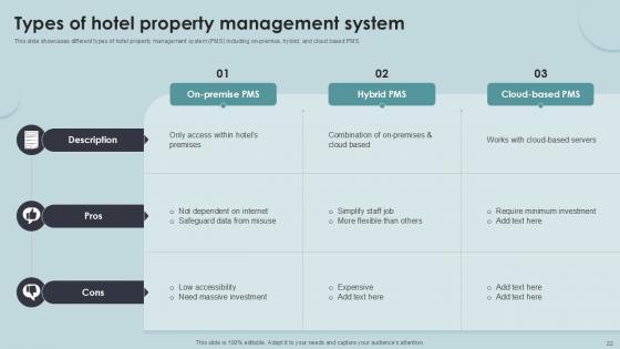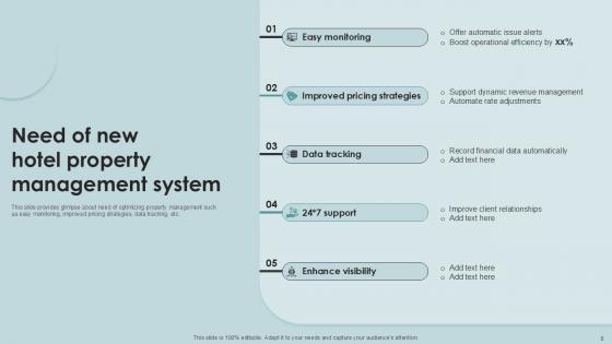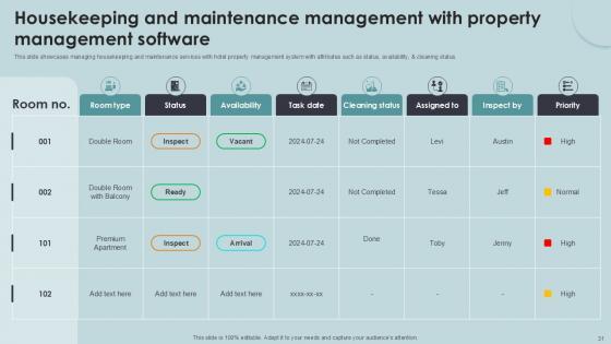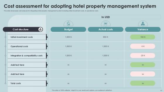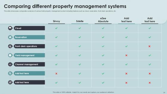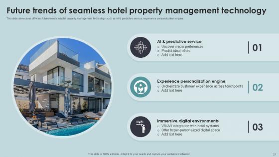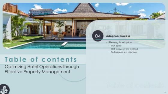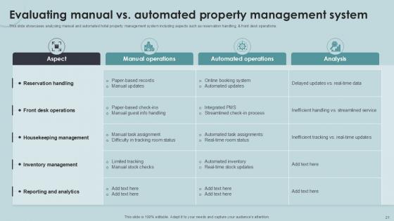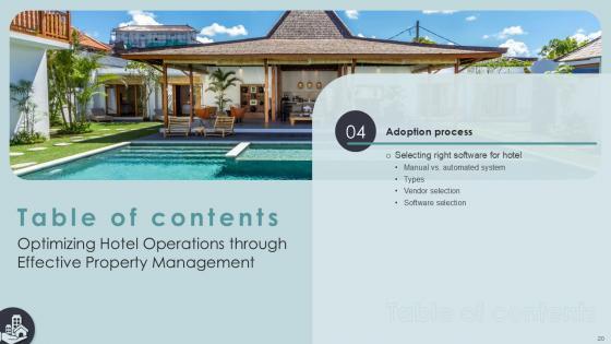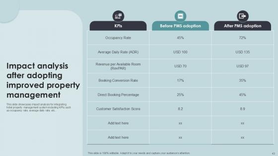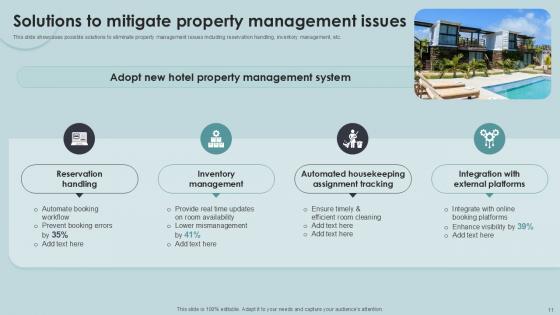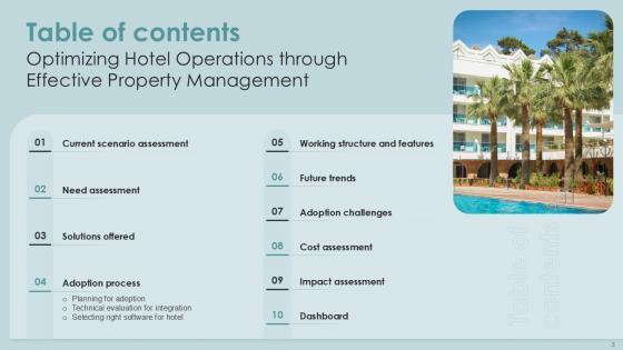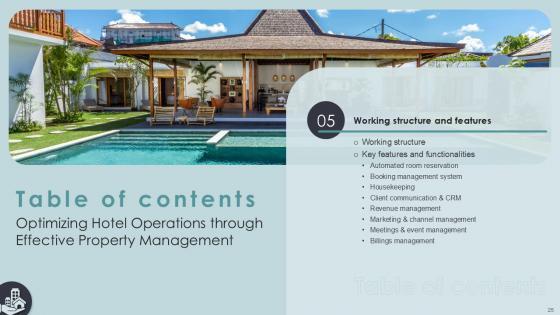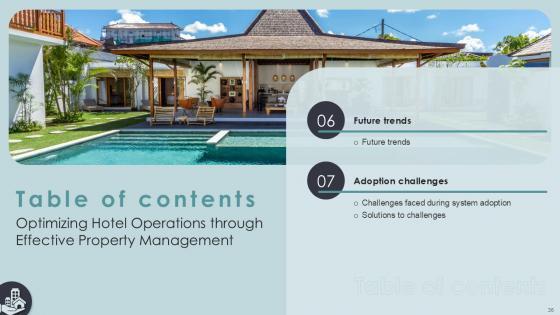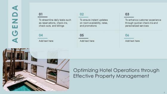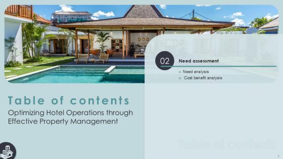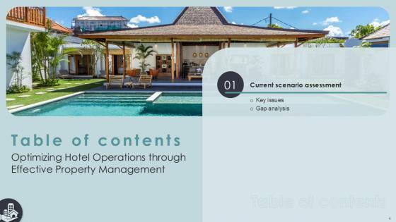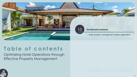 This Optimizing Hotel Operations Through Effective Property Management PPT Example is a primer on how to capitalize on business opportunities through planning, innovation, and market intelligence. The content-ready format of the complete deck will make your job as a decision-maker a lot easier. Use this ready-made PowerPoint Template to help you outline an extensive and legible plan to capture markets and grow your company on the right path, at an exponential pace. What is even more amazing is that this presentation is completely editable and 100 percent customizable. This fourty five slide complete deck helps you impress a roomful of people with your expertise in business and even presentation. Craft such a professional and appealing presentation for that amazing recall value. Download now. Our Optimizing Hotel Operations Through Effective Property Management PPT Example are topically designed to provide an attractive backdrop to any subject. Use them to look like a presentation pro.