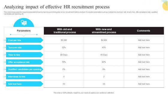 This slide showcases the impact assessment of new human resource hiring plan on key recruitment metrics involved. It includes parameters such as cost per hire, turnover rate, time to hire, offer acceptance rate, qualified candidates per opening, etc. Create an editable Aligning Human Resource Hiring Procedure Analyzing Impact Of Effective HR Recruitment Process Graphics PDF that communicates your idea and engages your audience. Whether you are presenting a business or an educational presentation, pre designed presentation templates help save time. Aligning Human Resource Hiring Procedure Analyzing Impact Of Effective HR Recruitment Process Graphics PDF is highly customizable and very easy to edit, covering many different styles from creative to business presentations. Slidegeeks has creative team members who have crafted amazing templates. So, go and get them without any delay.