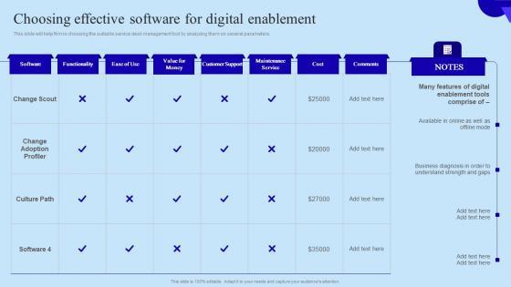 This slide will help firm in choosing the suitable service desk management tool by analyzing them on several parameters. There are so many reasons you need a Choosing Effective Software For Digital Organisational Digital Innovation Template PDF. The first reason is you can not spend time making everything from scratch, Thus, Slidegeeks has made presentation templates for you too. You can easily download these templates from our website easily. This slide will help firm in choosing the suitable service desk management tool by analyzing them on several parameters.