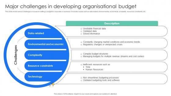 This slide shows various challenges or issues in crafting a budget for corporate or business. It includes issues such as data related, environmental, economical, complexity, resources constraints, etc. This modern and well-arranged Major Challenges In Developing Organisational Effective And Efficient Tools To Develop Fin SS V provides lots of creative possibilities. It is very simple to customize and edit with the Powerpoint Software. Just drag and drop your pictures into the shapes. All facets of this template can be edited with Powerpoint, no extra software is necessary. Add your own material, put your images in the places assigned for them, adjust the colors, and then you can show your slides to the world, with an animated slide included. This slide shows various challenges or issues in crafting a budget for corporate or business. It includes issues such as data related, environmental, economical, complexity, resources constraints, etc.