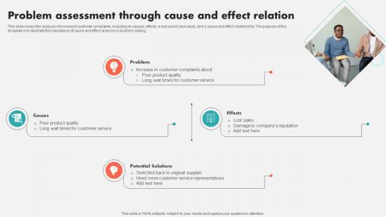 This slide covers the analysis of increased customer complaints, including its causes, effects, a real world case study, and a cause and effect relationship. The purpose of this template is to illustrate the importance of cause and effect analysis in problem solving.Pitch your topic with ease and precision using this Problem Assessment Through Cause And Effect Relation Ideas Pdf This layout presents information on Potential Solutions, Poor Product Quality, Damage Companys Reputation It is also available for immediate download and adjustment. So, changes can be made in the color, design, graphics or any other component to create a unique layout. This slide covers the analysis of increased customer complaints, including its causes, effects, a real world case study, and a cause and effect relationship. The purpose of this template is to illustrate the importance of cause and effect analysis in problem solving.