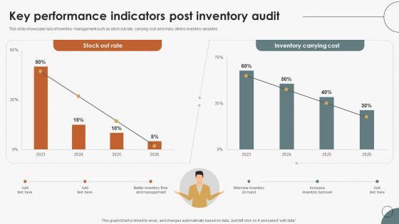 This slide showcases kpis of inventory management such as stock out rate, carrying cost and many others inventory variables. Make sure to capture your audiences attention in your business displays with our gratis customizable Boosting Efficiency In Inventory Key Performance Indicators Post Inventory Audit. These are great for business strategies, office conferences, capital raising or task suggestions. If you desire to acquire more customers for your tech business and ensure they stay satisfied, create your own sales presentation with these plain slides. This slide showcases kpis of inventory management such as stock out rate, carrying cost and many others inventory variables.