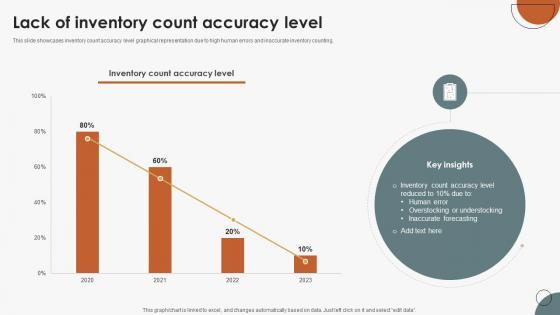 This slide showcases inventory count accuracy level graphical representation due to high human errors and inaccurate inventory counting. Formulating a presentation can take up a lot of effort and time, so the content and message should always be the primary focus. The visuals of the PowerPoint can enhance the presenters message, so our Boosting Efficiency In Inventory Lack Of Inventory Count Accuracy Level was created to help save time. Instead of worrying about the design, the presenter can concentrate on the message while our designers work on creating the ideal templates for whatever situation is needed. Slidegeeks has experts for everything from amazing designs to valuable content, we have put everything into Boosting Efficiency In Inventory Lack Of Inventory Count Accuracy Level. This slide showcases inventory count accuracy level graphical representation due to high human errors and inaccurate inventory counting.