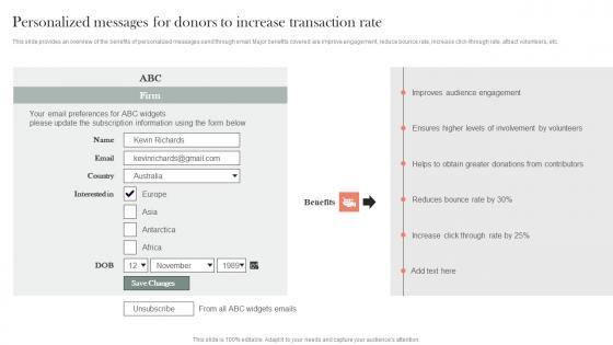 This slide provides an overview of the benefits of personalized messages send through email. Major benefits covered are improve engagement, reduce bounce rate, increase click-through rate, attract volunteers, etc.Whether you have daily or monthly meetings, a brilliant presentation is necessary. Personalized Messages For Donors To Increase Transaction Rate Efficient Nonprofit Marketing can be your best option for delivering a presentation. Represent everything in detail using Personalized Messages For Donors To Increase Transaction Rate Efficient Nonprofit Marketing and make yourself stand out in meetings. The template is versatile and follows a structure that will cater to your requirements. All the templates prepared by Slidegeeks are easy to download and edit. Our research experts have taken care of the corporate themes as well. So, give it a try and see the results. This slide provides an overview of the benefits of personalized messages send through email. Major benefits covered are improve engagement, reduce bounce rate, increase click-through rate, attract volunteers, etc.