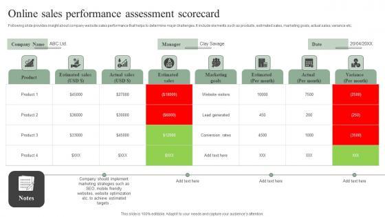 Following slide provides insight about company website sales performance that helps to determine major challenges. It include elements such as products, estimated sales, marketing goals, actual sales, variance etc. Slidegeeks is one of the best resources for PowerPoint templates. You can download easily and regulate Online Sales Performance Assessment Scorecard Efficient Marketing Tactics Brochure Pdf for your personal presentations from our wonderful collection. A few clicks is all it takes to discover and get the most relevant and appropriate templates. Use our Templates to add a unique zing and appeal to your presentation and meetings. All the slides are easy to edit and you can use them even for advertisement purposes. Following slide provides insight about company website sales performance that helps to determine major challenges. It include elements such as products, estimated sales, marketing goals, actual sales, variance etc.